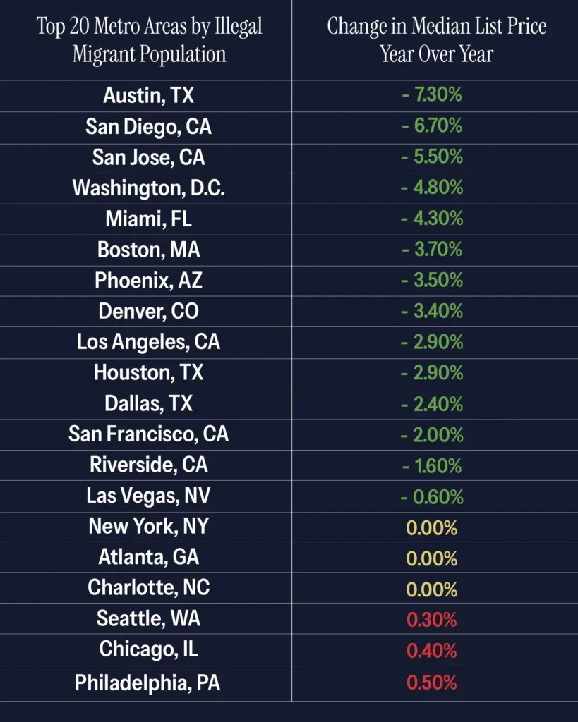 According to the administration, home list prices declined year over year in December in 14 of the 20 metropolitan areas with the largest populations of illegal migrants. The White House said overall home prices fell for the first time in more than two years, citing signs of improved housing affordability. The release noted that the three metro areas among the top 20 that experienced price increases were designated as sanctuary jurisdictions.